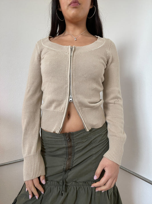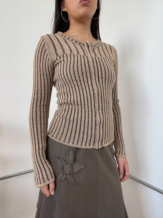 Brown Two-Toned Ribbed Zip Up Cardigan