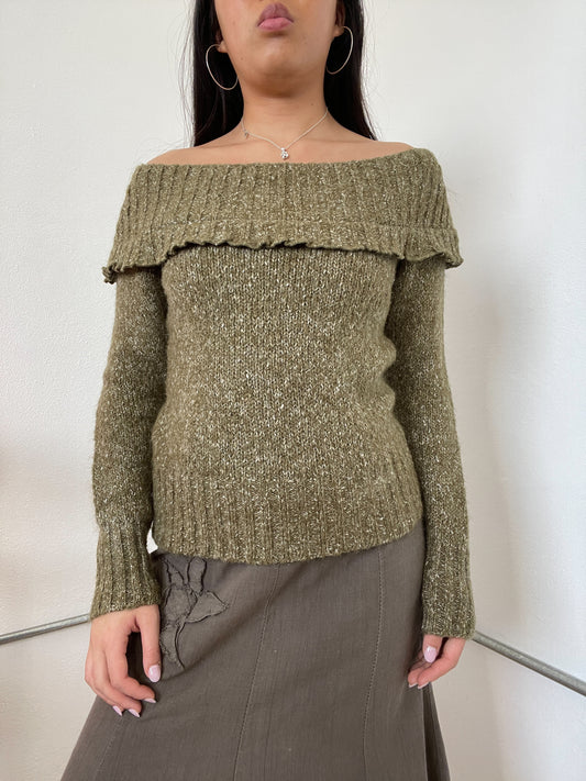 Green Knitted Off The Shoulder Long Sleeve