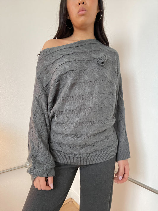 Grey Knitted Off The Shoulder Long Sleeve Jumper