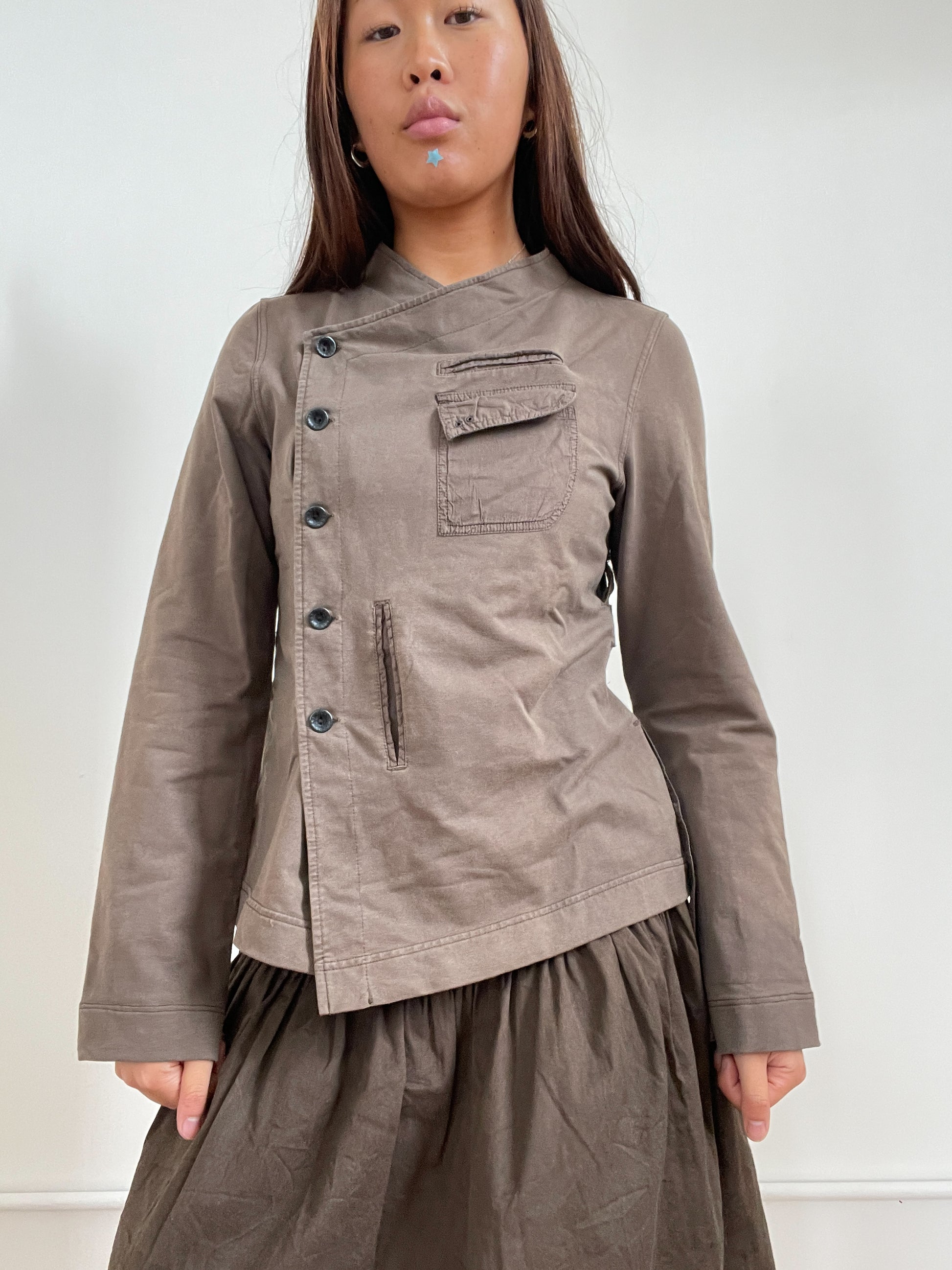Vintage brown asymmetric button up jumper, featuring pocket details on the front