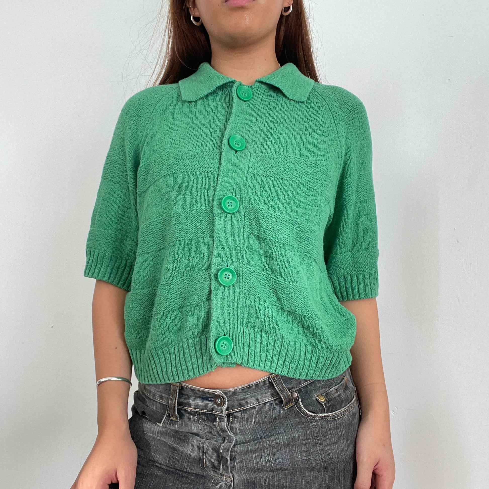 Vintage green knitted button up collared shirt top, ribbed hems with subtle striped texture