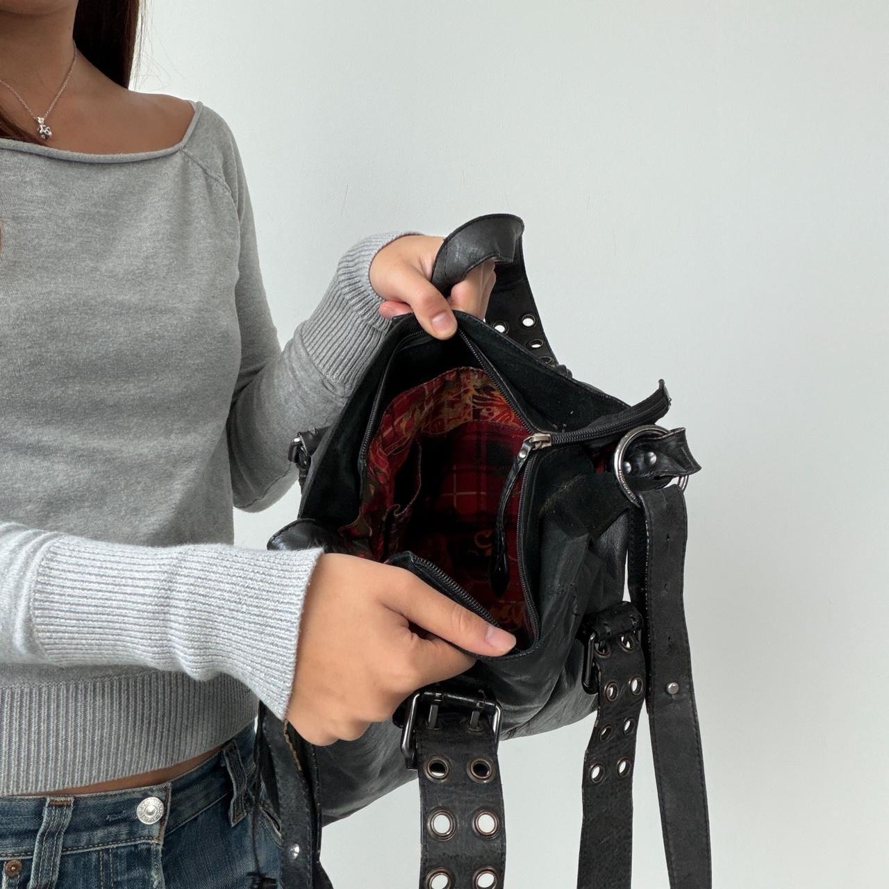 Black leather grommet handle shoulder bag with longer strap, zip closure and lining
