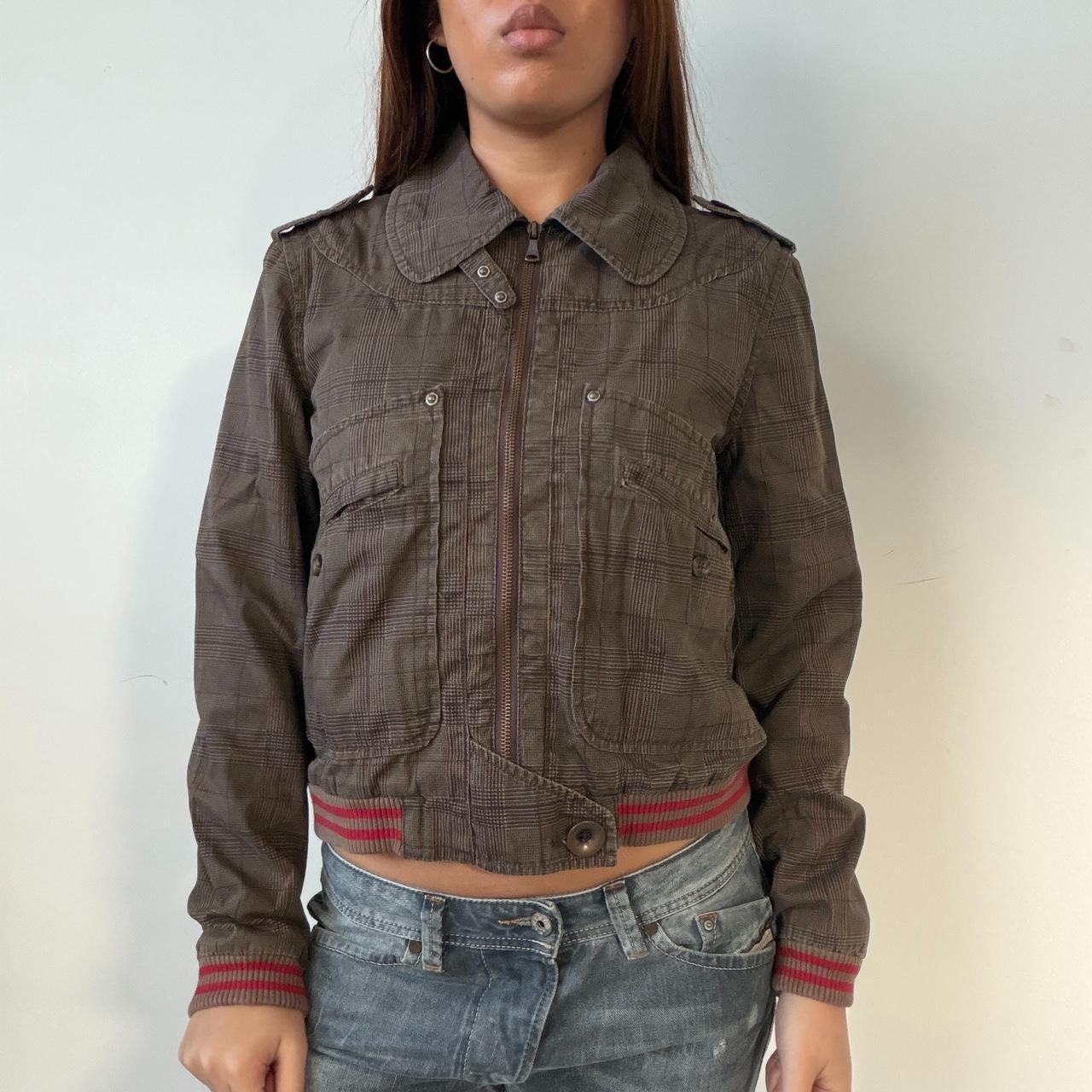 Vintage brown checkered jacket with ribbed hem and cuffs with red stripe• size M