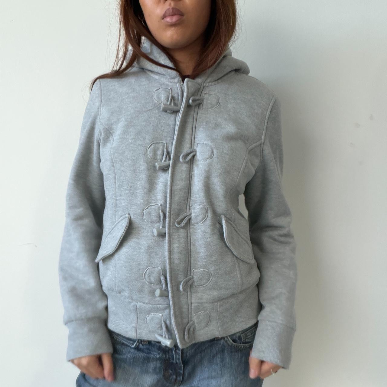 Vintage grey zip up button up jacket with shearling hood• size S/M